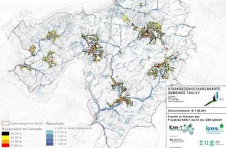 In diesem Zusammenhang wurde im Rahmen des Projektes KAN-T eine Starkregengefahrenkarte entwickelt, die eine wichtige Planungsgrundlage für zukünftige Infrastrukturmaßnahmen darstellt. Zusätzlich haben die Bürger*innen mithilfe dieser Karte die Möglichkeit, sich über mögliche Gefahren für Gebäude zu informieren, um geeignete bauliche Anpassungsmaßnahmen zu ergreifen.