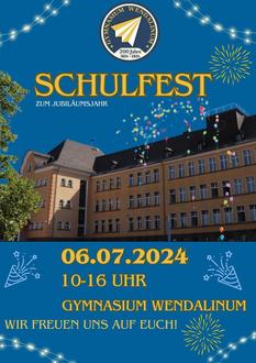 Im Rahmen des 200-jährigen Jubiläums lädt das Gymnasium Wendalinum am 06.07.2024 zum Schulfest ein. Dabei wird auch diese Feier das Jubiläumsmotto „200 Jahre Wendalinum – Tradition trifft auf Moderne“ in Form allerlei Aktivitäten aufgreifen. Entsprechend können sich die Gäste auf einen Tag freuen, an dem sie eingeladen sind, in alten Erinnerungen zu schwelgen, aber auch die Schule von ihrer modernen Seite neu kennenzulernen. Für das leibliche Wohl wird natürlich ausreichend gesorgt sein. Die Schulgemeinschaft des Gymnasium Wendalinum freut sich auf Ihren Besuch!