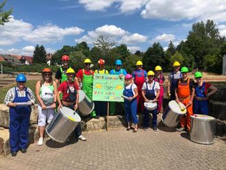 Bei angenehmen Temperaturen um die 30 Grad durften dann die schweren Trommeln in Bauarbeitermontur durch Theley getragen werden.