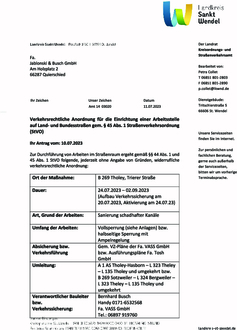 Wegen dringend notwendiger Kanalbauarbeiten und gesetzlich einzuhaltender Vorschriften zur Arbeitssicherheit sowie anderer Vorgaben muss die Ortsdurchfahrt von Tholey entlang der B269 („Trierer Straße“) von Montag, 24. Juli, bis voraussichtlich Samstag, 2. September, zwischen der „Sporstraße“ und der Straße „Am Schaumberg“ voll gesperrt werden.