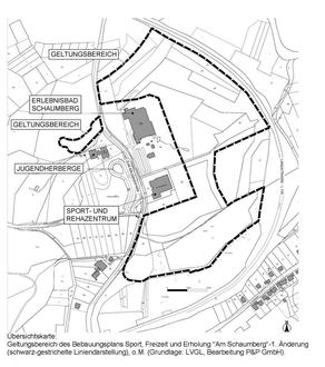 Die genauen Ausmaße (Geltungsbereich) des Bebauungsplans „Sport, Freizeit und Erholung ‚Am Schaumberg‘ – 1. Änderung“ sind aus nachstehender Übersichtskarte ersichtlich. Die Änderungen umfassen eine Fläche von ca. 12,3ha.
