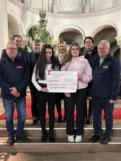 Im Anschluss an den Gottesdienst überreichten Schülerinnen der Klassenstufe 9 gemeinsam mit den beiden Religionslehrerinnen Julia Brüßel und Josefine Miller sowie Schulleiter Alexander Besch eine Spende über 400 Euro an den Wünschewagen.