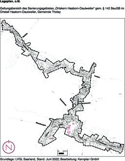 (1) Der räumliche Geltungsbereich des Sanierungsgebietes umfasst alle Grundstücke und Grundstücksteile innerhalb der im anliegenden Lageplan im Maßstab 1:1000 (Grundlage: LVGL Saarland, Stand: Juni 2022) durch eine Umgrenzungslinie abgegrenzten Fläche. Der Lageplan ist Bestandteil der Satzung und wird zu jedermanns Einsicht bei der Gemeinde Tholey, Rathaus, während den allgemeinen Dienststunden bereitgehalten.