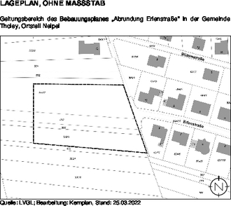 Im Ortsteil Neipel in der Gemeinde Tholey soll westlich der Erlenstraße neuer Wohnraum in Form einer „Ortsabrundung“ geschaffen werden. Konkret handelt es sich hierbei um ca. 7 Wohngebäude, die auf einer bislang unbebauten Grün- bzw. Freifläche am südlichen Siedlungsrand errichtet werden. Die Erschließung des Plangebietes erfolgt über die Erlenstraße und wird durch die Errichtung einer Stichstraße mit Wendehammer gesichert. Die erforderlichen Stellplätze können vollständig innerhalb des Geltungsbereiches organisiert werden.