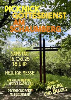 Am Samstag, 16. August, sind ab 18:00 Uhr alle ganz herzlich eingeladen zu einem gemütlichen Picknick-Gottesdienst an dem Kreuz bei der Afrika-Kapelle auf dem Schaumberg.