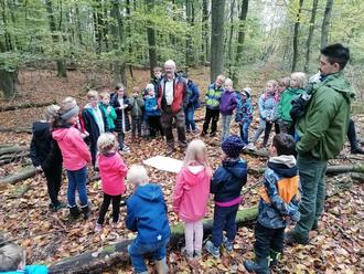 In der ersten Ferienwoche ging es, ausgestattet mit Wanderschuhen, Stock und Rucksack, zur „dick Eich“ am Huhnerberg, wo uns Förster Bernhard Paul und sein Kollege Nils erwarteten. Nach einer netten Begrüßung und einem Fragequiz des Försters ging es querfeldein zum Wald-Memory. Förster Paul erklärte uns die Veränderung der Natur im Herbst und wie die Tiere sich im Winter um ihre Nahrung kümmern.