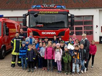 Auch die freiwillige Feuerwehr Hasborn ermöglichte uns einen Besuch im Feuerwehrgerätehaus. Löschbezirksführer Manuel Weber und sein Feuerwehrkamerad Marc Rauber begrüßten uns in voller Montur. Nach einem ausführlichen Rundgang durch das Gerätehaus mit vielen Fragen der Kinder ging es an die Fahrzeuge. Hier durfte Hand angelegt und alles genau inspiziert werden. Durch kindgerechte Experimente wurde erklärt, wie ein Brand entsteht und am besten gelöscht wird. Marc rüstete sich komplett für einen Feuerwehreinsatz mit seiner persönlichen Schutzausrüstung mit Atemschutzgerät aus. So sahen die Kinder, wie ein Feuerwehrmann im Ernstfall auf sie zukommen würde.