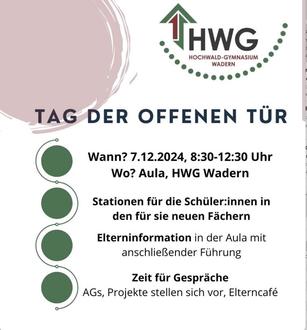 Das Hochwald-Gymnasium Wadern lädt die Grundschülerinnen und Grundschüler der Klassenstufe 4 sowie deren Eltern am Samstag, dem 07. Dezember 2024, von 8.30 bis 12.30 Uhr zu einem Tag der offenen Tür ein. An diesem Vormittag besteht die Möglichkeit, das Hochwald-Gymnasium als lebendige Schule kennenzulernen. Zunächst werden die Kinder und Eltern vom Schulleitungsteam in der Aula begrüßt. Die Eltern werden dort in einem kurzen Vortrag über das pädagogische Konzept des HWG sowie über die organisatorischen Rahmenbedingungen des Unterrichts am Gymnasium informiert. Außerdem werden die Betreuungsmöglichkeiten in der FGTS vorgestellt. Anschließend führen Lehrkräfte der Schule die Eltern in Kleingruppen über das Schulgelände und stehen für weitere Fragen zur Verfügung. Währenddessen können die Kinder Einblicke in die Fachbereiche Naturwissenschaften, Erdkunde, Englisch, Französisch, Kunst, Musik und Sport gewinnen und sich unter Anleitung von Fachlehrerinnen und Fachlehrern spielerisch erproben. Bei einer Tasse Kaffee und einem kleinen Imbiss können im Bereich der Mensa die gewonnenen Eindrücke im Gespräch vertieft werden. Für jüngere Geschwisterkinder bietet das HWG ab 8.30 h eine Betreuungsmöglichkeit an.