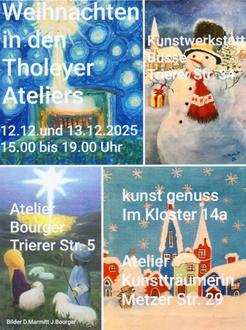 Wenn der Duft von Glühwein und Plätzchen durch die Gassen zieht wird es wieder Zeit für kreative Entdeckungen. Am 12.12. und 13.12. 2025 von 15:00h bis 19:00h öffnen in Tholey fünf Künstlerinnen ihre Werkstätten für Besucher und Besucherinnen. Interessierte können in stimmungsvoller Atmosphäre durch die Ateliers schlendern, Kunst gnießen und vielleicht das perfekte Weihnachtsgeschenk finden. Zu sehen gibt es Acrylbilder, Aquarelle, Zeichnungen, Collagen, ob groß oder in Postkartenformat, Glasschmuck und Objekte – jedes Werk ein Unikat. Die Künstlerinnen erzählen gern wie aus Ideen, Farben und Materialien ihre Werke entstehen. Für eine gemütliche Adventsstimmung sorgen selbstgebackene Plätzchen, heißer Glühwein und Kerzenschein. Wer Lust auf einen inspirierenden Adventsnachmittag hat ist herzlich eingeladen vorbeizuschauen und die kreative Vielfalt Tholeys zu entdecken.