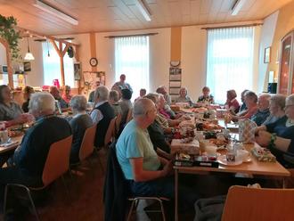 Zur Weihnachtsfeier treffen wir uns jedes Jahr im Feierraum der Gamstädter Feuerwehr, denn hier steht der festlich geschmückte Weihnachtsbaum und es ist Platz für alle. Zur Feier kamen 19 Frauen und Männer, die meisten mit süßen Weihnachtssymbolen dekoriert: einige Geweihe vom Rentier ragten stolz in den sonnigen Himmel und etliche hatten sich kleine Zipfelmützchen als Spange oder Brosche angesteckt. Der Raum war weihnachtlich vorbereitet und die Tafel mit Äpfeln, Mandarinen und Nüssen geschmückt sowie mit Tellern voller Gebäck, Stollen und Lebkuchen eingedeckt. In der Küche waren Ortschaftsbürgermeister Peter Leuteritz und Wichtel Antonia fleißig beim Vorbereiten der Heißgetränke.