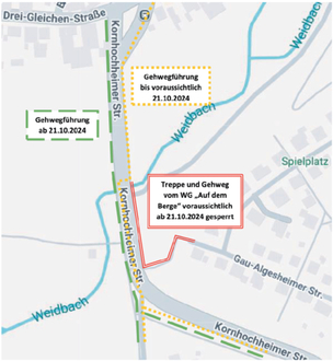 In der weiteren Folge werden die östlich der Kornhochheimer Straße gelegenen Gehwege zur Baufeldfreimachung zurück gebaut und stehen nicht mehr zur Verfügung. Dadurch ist auch die Treppenanlage zum Wohngebiet „Auf dem Berge“ (Kornhochheimer Straße - Gau - Algesheimer-Straße) zu sperren und kann nicht mehr genutzt werden. Fußgänger aus diesem Bereich nutzen daher ab Beginn der Sperrung der Treppe die Anbindung des Wohngebietes über den Herrnhuter Weg zur Kornhochheimer Straße.