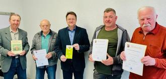 Die Kreis-Pilzberater Klaus Gründonner (l.), Manfred Siegel (2.v.l.), Michael Vogel (2.v.r.) und Peter Püwert (r.) mit Landrat Robert Sesselmann (M.) bei der Übergabe ihrer Berufungsurkunden. Es fehlt Sven Heinz. (Foto: LRA SON)