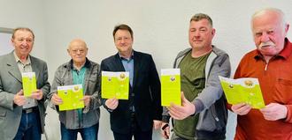 Die Pilzberater und der Landrat mit dem neuen Faltblatt der Ehrenamtlichen Beauftragten des Landkreises (Foto: LRA SON)