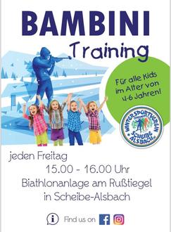 Der WSV Scheibe-Alsbach bietet für alle interessierten Kinder im Alter von 4 bis 6 Jahren jeden Freitag von 15.00 bis 16.00 Uhr ein Schnuppertraining auf der Biathlonanlage am Rußtiegel an.
