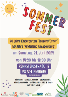 Der Kindergarten Tausendfüßler wird 40 Jahre alt, das Kinderland am Apelsberg feiert stolze 50 Jahre. Gemeinsam möchten wir diesen besonderen Anlass mit einem tollen Sommerfest begehen - und wir laden EUCH herzlich dazu ein!