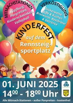 auch das Ordnungsamt der Stadt Neuhaus am Rennweg möchte Sie auf das Kinderfest am 01. Juni 2025 aufmerksam machen. Die Veranstaltung findet auf dem Rennsteigsportplatz statt.