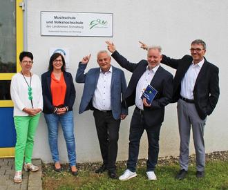 Die Leiterinnen der Kreismusikschule und der Volkshochschule, Petra Adelbert (l.) und Corina Müller (2.v.l.), freuen sich gemeinsam mit dem amtierenden Landrat Jürgen Köpper (M.), dem Landtagsabgeordneten und Neuhäuser Vize-Bürgermeister Henry Worm (2.v.r.) sowie dem Leiter des Kulturverbunds des Landkreises, Uwe Scheler (r.), über die neu geschaffenen Außenstellen in der Rennsteigstadt. alle Fotos: LRA SON, M. Volk