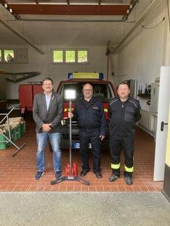 Bürgermeister Uwe Scheler, Stadtbrandmeister Jörg Müller und der Wehrführer der Ortsteilfeuerwehr Steinheid Mirko Jakob bedanken sich bei der SV Sparkassen Versicherung für das LED-Beleuchtungssystem, welches bei zukünftigen Einsätzen eine große Hilfe sein wird.