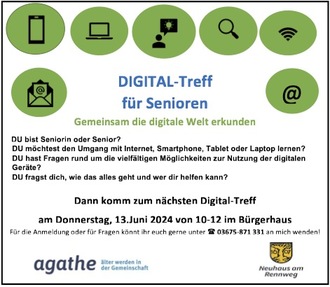 Als AGATHE-Beraterin bin ich Ihre Ansprechpartnerin, für alle Fragen, die der Alltag als älterer Mensch mit sich bringt. Die Beratungen sind kostenfrei und unverbindlich! Das Angebot richtete sich an alleinlebende Seniorinnen und Senioren ab 65 Jahren und bietet die Möglichkeit, verschiedene Themen wie Gesundheit, Vorsorge, Finanzen, Wohnen, Krisen, Einsamkeit und sonstige Themen und Fragen die das Älterwerden mit sich bringt, vertraulich anzusprechen. Ebenso erhalten Sie Unterstützung bei Fragen im Umgang mit dem Handy, Smartphone oder Tablet.