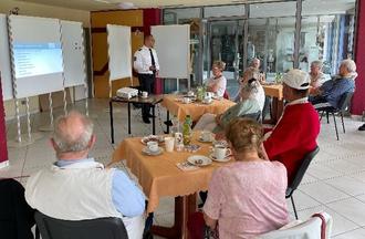 In seinem „Präventionsvortrag von Kriminalität zum Nachteil von Senioren“, erwies sich Herr Polizeiobermeister Arthur Hofmann als kompetenter und sympathischer Fachmann auf diesem Gebiet. Er stellte die aktuellen Betrugsmaschen wie „Enkeltrickbetrug“, „Falsche Polizeibeamte“, „Pishing-Mailangriffe“, „Tinder-Scam“ (Online Liebe), „Haustür-Diebstahl“, „Fake-Inkasso“ und weitere vor. Zu jedem Thema zeigte er ein Kurzvideo, welches die verschiedenen Betrugsmaschen originalgetreu darstellte und den Vortrag lebendig machte. Aufmerksam und interessiert hörten die Senioren zu und brachten eigene Erfahrungen mit ein.
