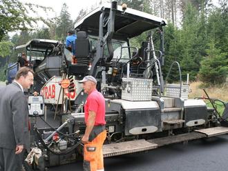 Durch das Aufbringen einer neuen Deckschicht werden auf der Kreisstraße 35 Risse und Schlaglöcher beseitigt. Landrat Robert Sesselmann begutachtete den Baufortschritt der Investitionsmaßnahme im Umfang von 150.000 Euro.