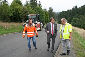 Landrat Robert Sesselmann begutachtete den Baufortschritt der Investitionsmaßnahme und kam vor Ort mit den Mitarbeitern der bauausführenden Firma ins Gespräch. Zudem informierten ihn Uwe Buhmann (Tiefbaufachmann im Gebäude- und Liegenschaftsmanagement des Landratsamtes Sonneberg) und Sebastian Hertha (Leiter der Kreisstraßenmeisterei) über das Bauvorhaben. Durch die Kreisstraßenmeisterei wird in Folge noch das Bankett der K 35 erneuert. Die Straßenmarkierungen folgen im Herbst.