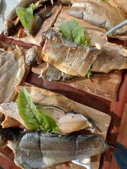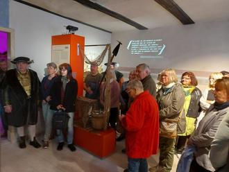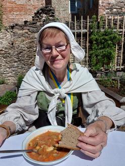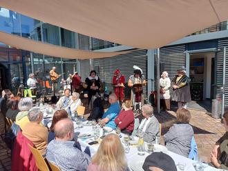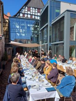 Den Fortgang fand die Veranstaltung im Hof des Lutherhauses. Weißes Geschirr, blankpolierte Gläser und liebevolle Details ließen einen gemütlichen Mittag erwarten. Als die Neustädter Gruppe Eulenspiegel ihren ersten Titel erklingen ließ, wusste man sogleich, dass Kurzweil, ein gutes Kulturprogramm und jede Menge Heiterkeit folgen würden. Die Herren des Alten Rates, begleitet von einer Marketenderin und einem Vertreter der Tuchmachergarde, stimmten in diesen Reigen sogleich mit ein. Historische Hintergründe und das Besondere aus Neustadts Bauernkriegsgeschichte wechselten sich mit Musik ab, bis dann der Fisch auf den Tisch kam. Frisch geräucherte Forelle, selbstgebackenes Brot und ein schmackhafter Fischtopf wurden serviert. Die Küche des Hotels „Stadt Neustadt“ verstand es, die Gäste mit diesen Gaumenfreuden zu verwöhnen. Dazu gab die Tischgesellschaft mit 70 Gästen einen wunderbaren Rahmen. Eines darf verraten werden: Unter den Gästen befanden sich, und dies ist wohl einzigartig, alle Einwohner von Sorga, dem ehemaligen Vorwerk vor der Stadt.