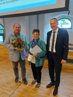 Bürgermeister Weiß (rechts) und der Fraktionsvorsitzende der Fraktion DIE LINKE, Thomas Hoffmann, gratulieren Frau Gabriele Kühn