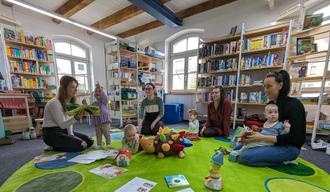 Die Stadtbibliothek lädt seit März monatlich zum Treff der Bücherbabys ein und freut sich über eine wachsende Zahl an Teilnehmern und Interessierten. Auf dem großen, runden Spielteppich, der explizit für die Veranstaltung angeschafft wurde, treffen sich Eltern und der Nachwuchs, um gemeinsam Fingerspiele, gesungene Reime und Krabbelspiele auszuprobieren. Im Fokus steht die frühkindliche Lese- und Sprachförderung. Gern nutzen die jungen Familien zudem die Möglichkeit, sich auszutauschen, miteinander zu spielen oder die Bibliothek selbstständig zu erkunden.