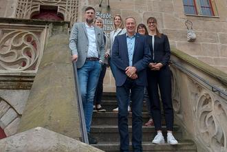 Bundestagsabgeordnete Diana Herbstreuth (rechts) mit Bürgermeister Ralf Weiße (vorn) und den Fachdienstleiterinnen und dem Fachbereichsleiter
