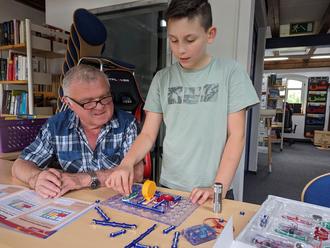 Zur Verfügung stehen in der Bibliothek unter anderem Metall- und Elektrobaukästen. Was damit alles möglich ist, haben die jungen Besucher der vergangenen Wochen gemeinsam mit Andreas Bauer schon ziemlich intensiv entdeckt - ein Höhepunkt ist die eigenhändig gebaute Alarmanlage. Auch das Kugelbahnsystem GraviTrax oder die Holzeisenbahn von Brio können erprobt werden.