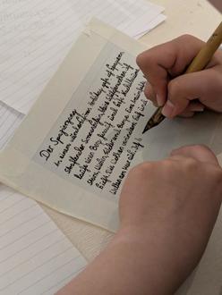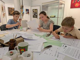 Die motivierten und vielseitig interessierten Ferienkinder konnten sich zuerst bei einer Führung mit den im Museum für Stadtgeschichte ausgestellten Objekten und Kunstwerken vertraut machen, um dann verschiedene Textformen und Genres des kreativen Schreibens kennenzulernen. So nahmen die Dinge im Museum bald die Gestalt von Haikus, Elfchen und kurzen Geschichten an und wurden kunstvoll zu Papier gebracht. Dass mit Tinte und Gänse- oder Rohrfeder auf Papier und Pergament zu schreiben, kein gänzlich leichtes Unterfangen ist, merkten die Workshopteilnehmer schnell, aber mit Geduld und Übung war es bald möglich, wahrhafte, kleine Schriftkunstwerke zu bewundern.