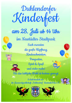Nachdem die Wetterprognosen zum internationalen Kindertag uns zu einer schmerzlichen Absage des ursprünglichen Termins gezwungen haben, freuen wir uns nun umso mehr, das Duhlendorfer Kinderfest mit euch gemeinsam nachzuholen.