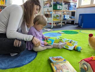 Nach etwa einem halben Jahr hat sich der Treff der Bücherbabys in der Stadtbibliothek zur frühkindlichen Lese- und Sprachförderung bereits fest im Monatskalender etabliert. Reime, Lieder und Krabbelspiele machen den kleinen wie großen Besuchern große Freude. Mit jedem Mal erweitert sich das Repertoire ein wenig. Auf dem großen, runden Spielteppich warten außerdem haptische Entdeckerspielsachen und Bücher für die Jüngsten.