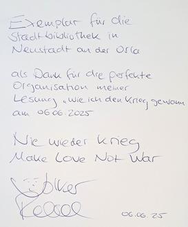 Den Vortrag mit Buchvorstellung, Filmszenen und Musik des Journalisten und Radiomoderators Volker Rebell am 6. Juni verfolgten exakt 62 Besucher. Rebell hat ein Buch über den englischen Antikriegsfilm „Wie ich den Krieg gewann“ veröffentlicht, der 1967 in die Kinos kam und als „respektlose Demontage sämtlicher Kriegsfilmklischees“ gilt. Der bekannteste Darsteller ist John Lennon, der auf dem Höhepunkt seiner Beatles-Karriere einen Soldaten des Zweiten Weltkriegs spielt. Die Sinnlosigkeit und Grausamkeit des Krieges wird auf satirisch-tragikomische Weise mit teilweise makabren Szenen vor Augen geführt. Ein Exemplar seines Buchs mit dem Titel „Ein Beatle in Verden“ hat Volker Rebell der Stadtbibliothek Neustadt übergeben, wo es seither ausgeliehen werden kann. Seine Widmung beendet der Kultmoderator mit den Worten: „Nie wieder Krieg - Make Love Not War“. - Dem ist nichts hinzuzufügen.
