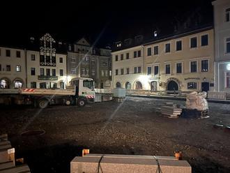 In Vorbereitung der Pflasterarbeiten wurden bereits sämtliche Entwässerungsrinnen und Straßeneinläufe auf dem Marktplatz verlegt. Nun folgt die Setzung der Randsteine für den Wasserlauf und auch der neue Standort der Postdistanzsäule auf dem Marktplatz ist bereits zu erkennen. Neben den Pflanzgruben für die Bäume wurde zudem die neue Hülse für den Weihnachts- und Maibaum eingebaut.