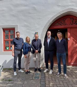 Minister Schütz (2.v.r.) mit Bürgermeister Weiße (Mitte) und den Fachbereichsleitern Schwalbe (links) und Heim (rechts) mit Fachdienstleiterin Weller