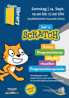 Programmieren oder Coding, wie es auch genannt wird, ist nur was für echte Profis? Weit gefehlt! Dank der internetbasierten, visuellen Programmiersprache Scratch ist Programmieren kinderleicht zu erlernen. Zur Open Library in der Stadtbibliothek am 14. September können Kinder ab etwa acht Jahren diese einmal ganz ausführlich testen. An Tablets oder Laptops erkunden wir gemeinsam alle Funktionen und starten mit kleinen Übungen wie einer fliegenden Katze oder unserem animierten Namen. Wer länger Zeit und Lust hat, kann bald auch ein kleines Spiel programmieren.