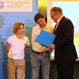 Ministerpräsident Mario Voigt überreicht Tobias Weise (Ortsteilbürgermeister Dreba und Vorstand der Kultur- und Heimatstiftung Dreba) und Sandra Röder-Petermann (Vorstand Kultur- und Heimatstiftung Dreba) die Urkunde.