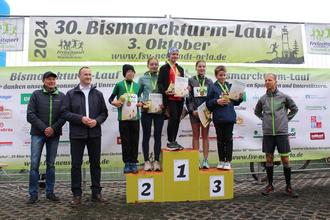 Zum diesjährigen Jubiläum gab es zunächst einige Ehrungen der besonderen Art. Die beiden Mitbegründer des Bismarckturmlaufes Günther Patzer und der leider schon verstorbenen Karl Häcker wurden für ihre Verdienste mit der Ehrenplakette des Saale-Orla-Kreissportbundes ausgezeichnet. Als jahrelanger Ausrichter dieses Laufes erhielt auch Kay Patzer diese Auszeichnung. Ebenso wurden vom Kreissportbund, vertreten durch Regine Kanis, das Orga-Team des Bismarckturmlaufes, Sandra Ott, Manja Hesse, Ines Wiechert, Thomas Schmidt, Ina Ricke und Dominik Larose, Maria Larose, Henry, Antje und Lena Spindler sowie Henning Schirmer für die außerordentlichen Verdienste um den Sport im Saale-Orla-Kreis mit der Ehrenplakette und Steffen Schötz und Beate Herrgott mit der Ehrennadel des Landessportbundes geehrt. Diese Auszeichnung nahm das Org-Team dankbar und mit Demut entgegen.
