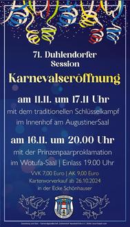 Auch in diesem Jahr lädt die Karnevalgesellschaft „Duhlendorf“ alle Neustädter, Gäste und Narren aus Nah und Fern dazu ein, den Beginn der 5. Jahreszeit mit uns gemeinsam zu feiern. Am Montag, den 11.11.2024 pünktlich um 17.11 Uhr wird in gewohnter Weise der Startschuss der 71. Session des Duhlendorfer Karnevals stattfinden.