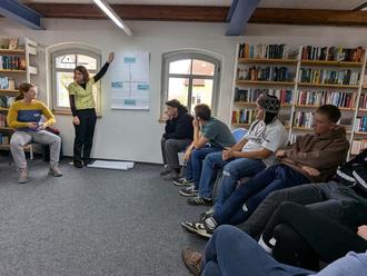 Das Szenario war Bestandteil des mobilen Escape Rooms „Auf Mikas Spuren“, den die Stadtbibliothek in Kooperation mit der Landeszentrale für politische Bildung anbieten konnte. Dafür entstand zwischen den Bücherregalen ein Jugendzimmer. Ziel war ein niedrigschwelliges Angebot zum Thema Populismus, dem sich auch eine Reflexion anschloss. Diese wurde, wie der Escape Room selbst, von zwei Mitarbeiterinnen der Agentur polyspektiv aus Berlin durchgeführt.