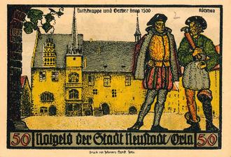 Das Neustädter Rathaus diente häufig als Motiv, auch für den Graphiker Georg Kötschau, der 1921 eine Serie mit Neustädter Notgeld gestaltete.