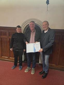 Bürgermeister Ralf Weiße (rechts) gratuliert Marcel Fügmann mit Sohn Julian