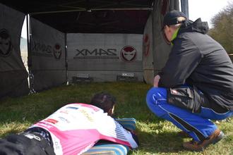 Am Schießstand gilt es, liegend mit dem Lasergewehr fünf Treffer zu setzen. Sechs Schuss stehen zur Verfügung, jeder Fehlschuss bedeutet eine Strafminute. Der gewählte Zeitpunkt des Schießens wird damit zur taktischen Entscheidung - und kann über Sieg oder Platzierung entscheiden.