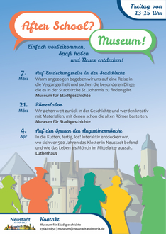 Alle zwei Wochen findet immer freitags ab 13.00 Uhr das Format „After School? Museum!“ im Lutherhaus oder im Museum für Stadtgeschichte statt. Eingeladen sind alle Kinder von der ersten bis zur fünften Klasse. In der Gruppe wird gemeinsam die Schulwoche verabschiedet, um einzutauchen in Fragen und Geheimnisse der Vergangenheit. Dabei dreht sich alles handwerklich-kreativ, spielerisch und mitunter auch denksportlich um jene Dinge, die kleine Geschichtsinteressierte umtreiben.