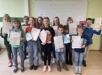 Die Schüler- und Lehrer-Jury wurde unterstützt von Frau Götze aus der Neustädter Stadtbibliothek sowie Herrn Albert, Inhaber des Thami-Verlags, der viele Bücher von Verena Zeltner veröffentlich hat. Wir bedanken und recht herzlich und gratulieren allen Lesefüchsen.