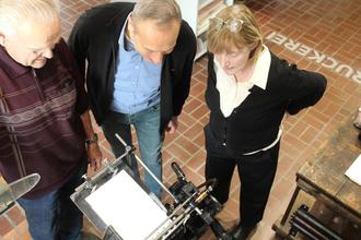 V.l.n.r.: Drucker Günter Roßner, Bürgermeister Ralf Weiße, Museumsdirektorin Schloß Burgk Sabine Schemmrich