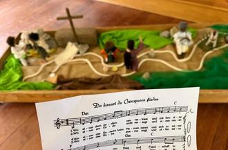 Oder das Jesus mit seinen Freunden (Jüngern) zum letzten Mal das Abendmahl einnahm. Und er dabei das Brot brach, Gott dankte und es herumreichte und gleiches mit dem Kelch tat und dabei sagte: „Tut das immer wieder, damit ihr euch an mich erinnert“. Wir taten es auch ganz praktisch, im Morgenkreis mit Brot und einem Schluck Weintraubensaft.