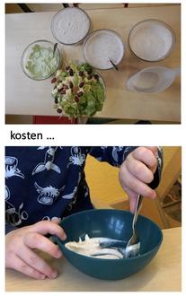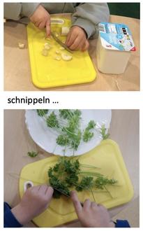 Die anderen Kinder schnitten frische Petersilie, frischen Schnittlauch und Zitronenmelisse klein. Dazu wurden noch Salz, Pfeffer, und ein Teelöffel Zucker gegeben, natürlich kamen auch hier Milchprodukte zum Einsatz.